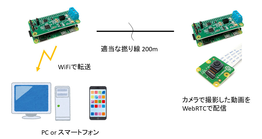 構成としては、SPE HAT miniを挿したRaspberryPi zero 2個を、弊社に転がっていた適当な撚り線200mで繋ぎWebRTCでカメラ映像を転送しています。 きちんと特性インピーダンスを考慮したツイストペアケーブルを使用すればより長い距離でも伝送できますが、この構成でも実測で9.1Mbpsの速度が出ます。
